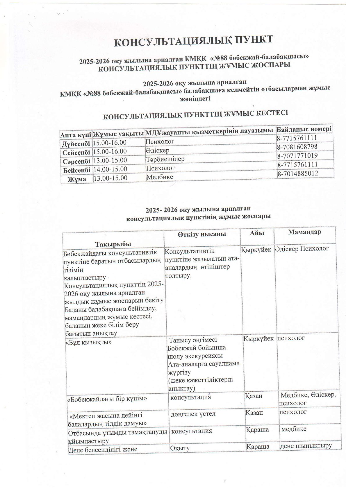 КМҚК "№ 88 бөбекжай-балабақшасы" 2025-2026 ж.кеңес беру пункті
