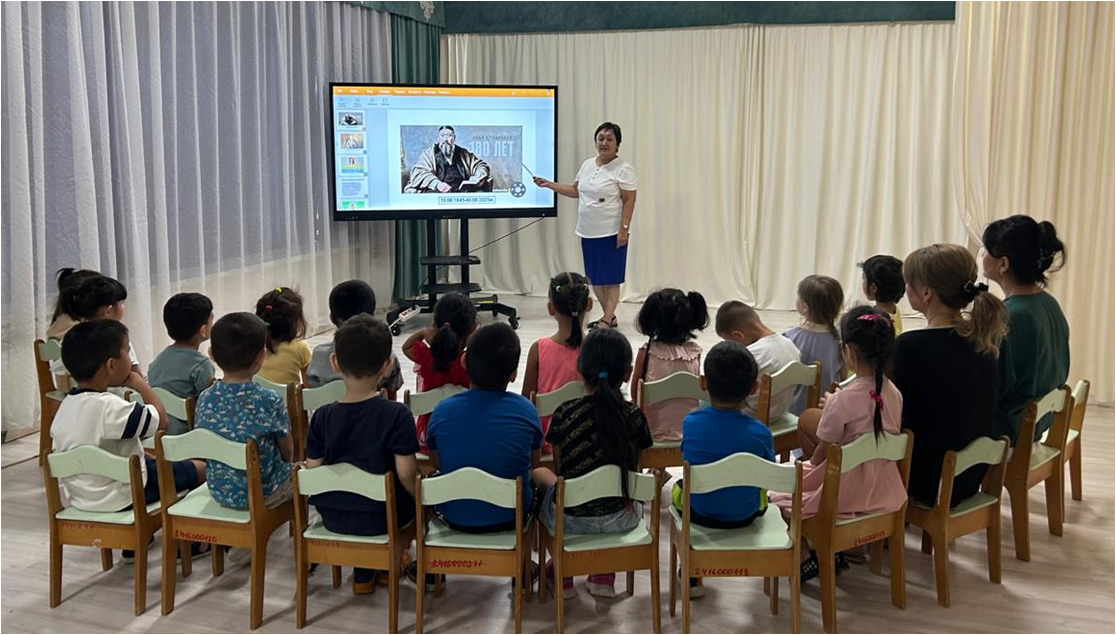 12 август 2025 0 1 2 3 4 5 "Абай Құнанбаев-180 жыл" ата-аналармен бірлесе, мектепалды "Балдәурен" тобы Абай өмірбаянымен танысып,әндерін тыңдауда.